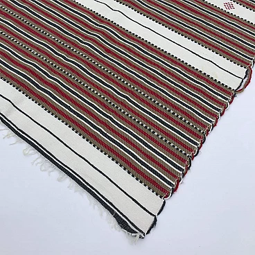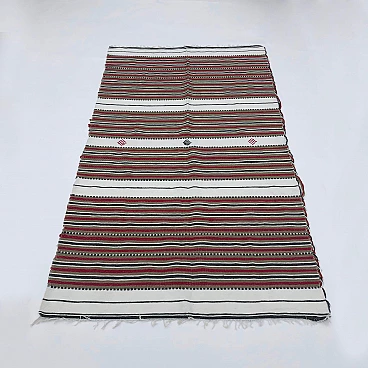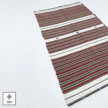 A vintage handmade wool rug from 1980s Algeria, in tricolour stripes of pleasing reds, browns, and blacks. The wool yarns come from ethically grown livestock, and are hand dyed and treated by locals using traditional organic methods – hence the high quality finish.