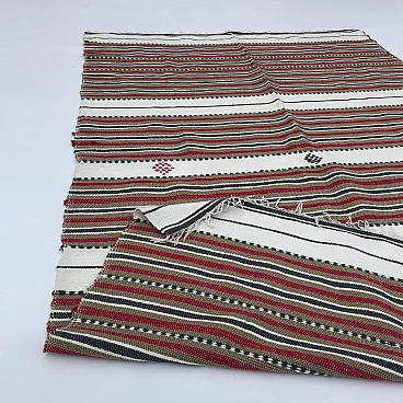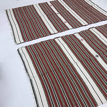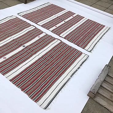 All rugs should be washed in cold water and dried flat. Please note two are available, but the price is for one rug. Wool, cotton, natural dyes. Lightly used. Slight wear consistent with age but overall good condition