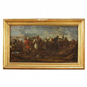 Old German painting from the end of the 17th/beginning of the 18th century. Oil painting on canvas depicting battle between Western and Arab knights with a good pictorial hand. Painting of great dynamism rich in decorative elements, horses and splendid armour (see photo). Wooden frame, not contemporary, carved and gilded with pleasant decoration and two colour fades (top and left corner, see photo). Work attributable to the German painter Christian Reder known as Monsu Leandro (1656-1729), lacking authentication. Painting that has recently undergone a conservative restoration, re-tinting, replacement of the frame and restoration of the colour in some points (see photo). Part of a pendant (see photo and ask for block price if available). In good condition with some signs of restoration. Light painting H 34 x W 63 cm.