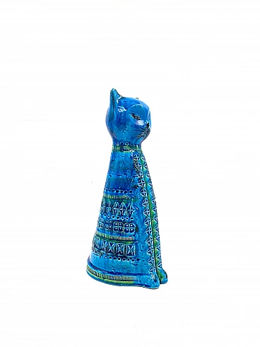 "Sitting Cat" Rimini blue series ceramic sculpture by Aldo Londi for Bitossi Ceramiche, Montelupo Italy. Decoration engraved by hand with various patterns stencilled on raw clay, under glossy blue crystalline glaze. Perfect, no defects.