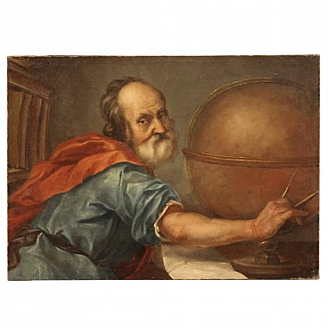 Antique Italian painting of the eighteenth century. Work oil on canvas depicting portrait of greek philosopher Democritus of good pictorial hand. Painting of nice size and pleasant decor, missing the frame, for antiquarians and collectors of old paintings. Painting of good dynamism and brightness adorned with decorative elements such as the large globe on the right and the library behind the philosopher (see photo). Painting that has undergone during the XX century an intervention of conservative restoration, re-tinting and color recovery in some points (see photo). Work in the complex in good state of conservation.
