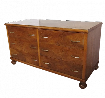 Particular low chest of drawers consisting of six large drawers made of walnut veneer and briar. It has four turned feet, six drawers with brass handles, wooden top. Particular is the height that allows it to be used as a convenient TV cabinet. Good condition, small signs of wear.