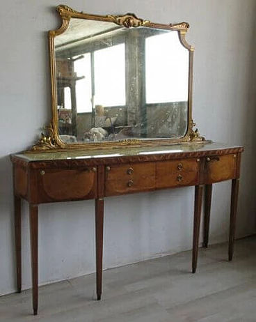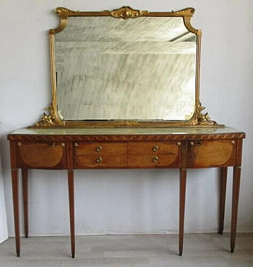 It has a glass top with a marbled effect, directoire's style feet with brass shoes, two doors that open at the sides and four central drawers.