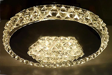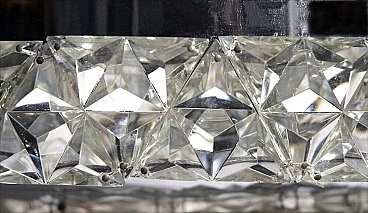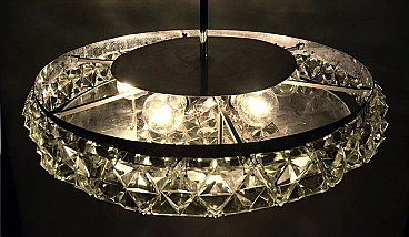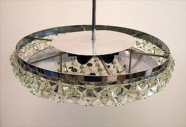 Chandelier attributed to Oscar Torlasco, 70s. Chromed brass structure with cut crystal gems applied on the circumference and bottom. Original electrical system, with six lights.