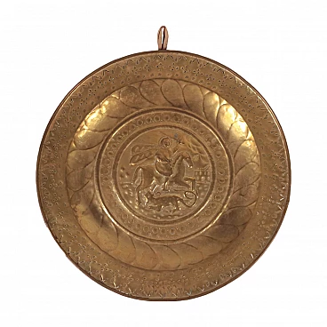 Gilded and embossed copper alms plate decorated with greeks and the figure of the Saint riding a horse.