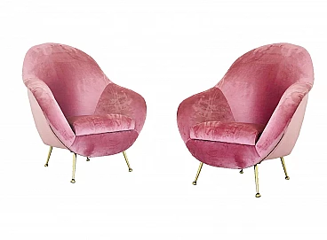 Pair of Italian armchairs from the 50s, lined in pink velvet. Wooden structure, brass feet and pink velvet upholstery. Completely restored, no defects or tears. Seat height 40 cm