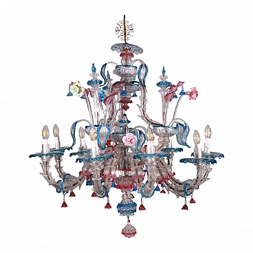 Twentieth century Murano chandelier with 9 lights in blown glass and colored glass.