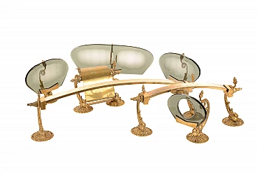 Set of 7 bathroom accessories made in the '50s with a brass structure worked with particular supports in the shape of fanciful animal looking like a dragon-serpent and with smoked-coloured ground glass parts. The set is composed of : 1 single soap dish measuring 19 x 16 x H 11 cm, 1 double soap dish measuring 33 x 16 x H 11 cm, 1 glass cup holder, glass perforated in the centre, cm 15 x 16 x H 11, 1 roll holder measures cm 20 x 16 x H 14, 1 small towel holder measures cm 38 x 16 x H 11, 1 large towel holder measures 59.5 x 16 x H 11 cm,