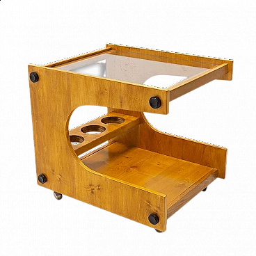 A service table/trolley on wheels, produced in the former Czechoslovakia in the 1970s. Simple design, beechwood frame, three holes for bottles or decanters. In very good condition, completely refurbished.