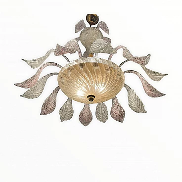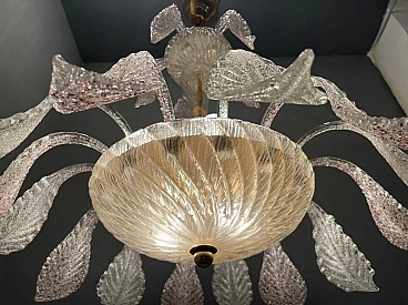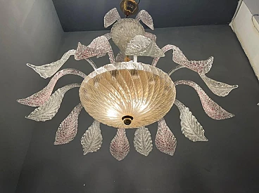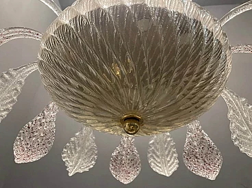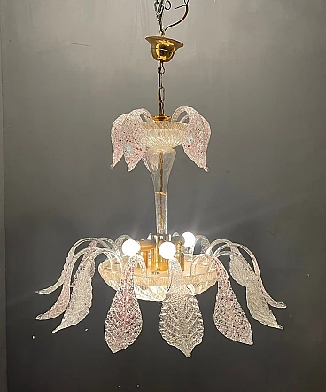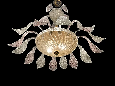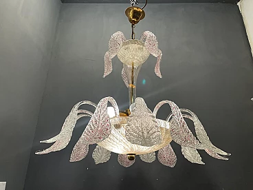 Frosted handmade Murano Glass leaves pink speckled and clear glass. Height including chain and ceiling canopy 70 cm, height without chain and ceiling canopy 50 cm. Chain can be lengthened or shortened to meet your needs . Features 6 lights, requires E14 light bulbs. Four lights face upwards and 2 are in the Murano glass bowl creating a soft diffusion of light. Shipping in a wooden crate for safe arrival.