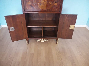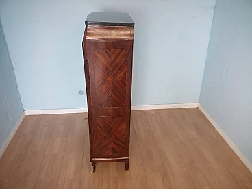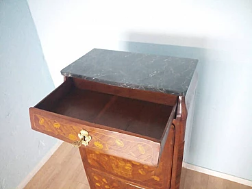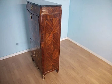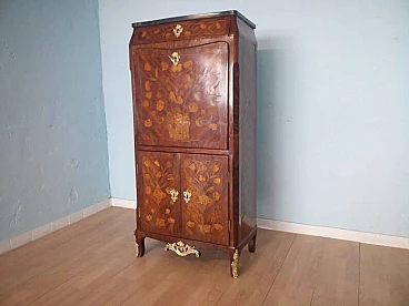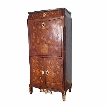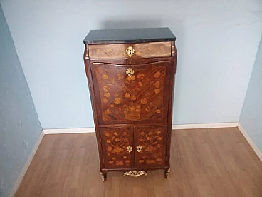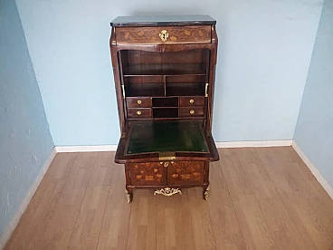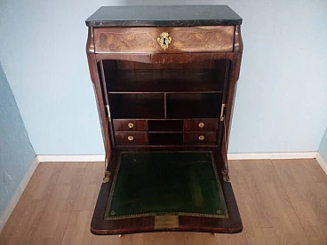Inlaid French Louis XV style secrétaire, curved front and sides. Pororo marble on top.