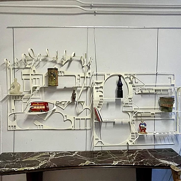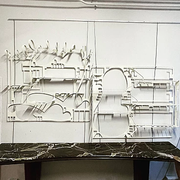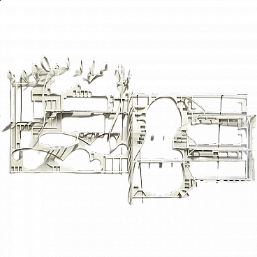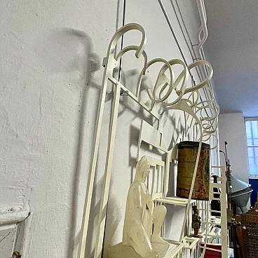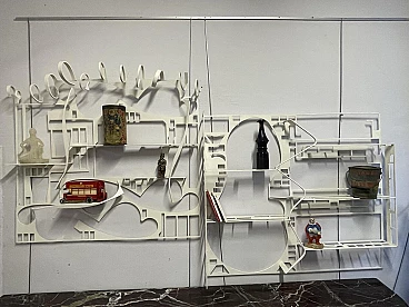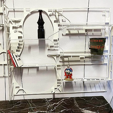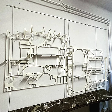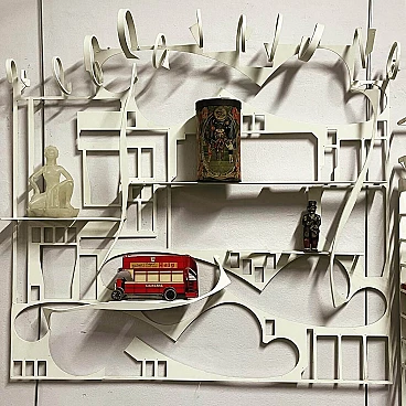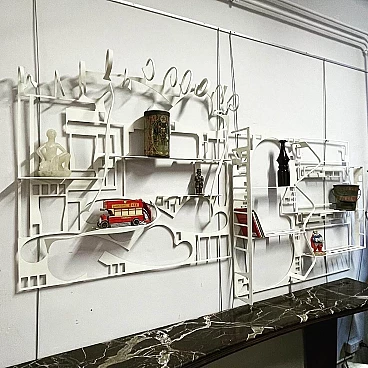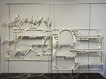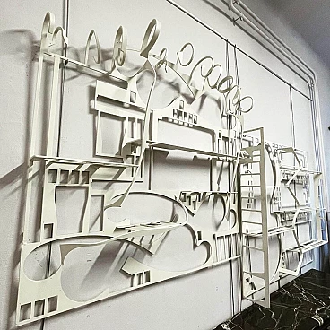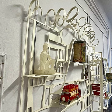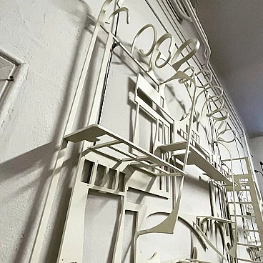 A pair of unique, sculptural panels, made by hand, in white enamelled iron. Each of them has a form, decorations and measures other than the other. They have small shelves on which to place objects or books. For the strong decorative prerogative, they are suitable for a home or for a room, or shop. The left panel measures 125x120x22cm. The right one measures 127x112x18cm.