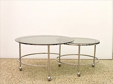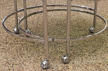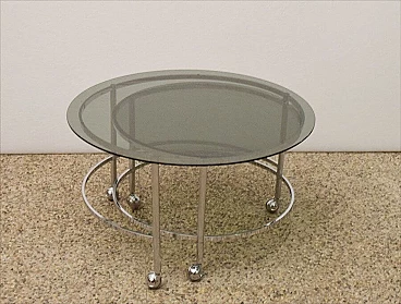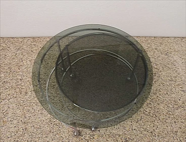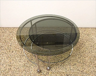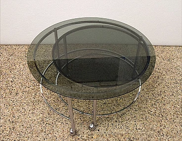 Revolving coffee table with 2 tops in chromed steel and smoked crystal, 70s