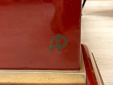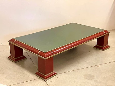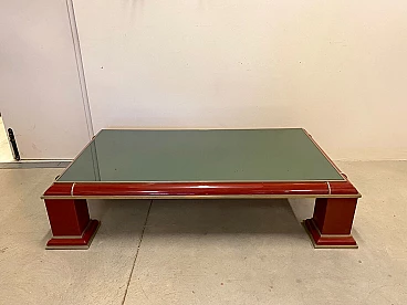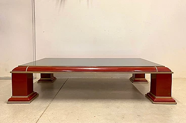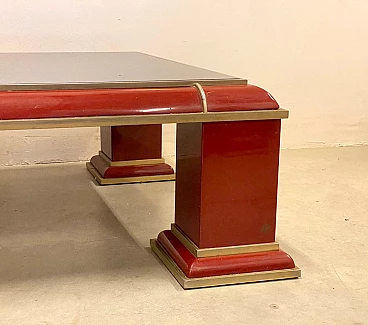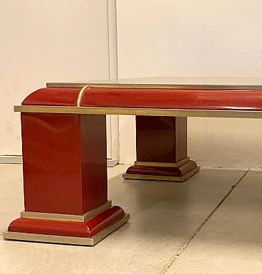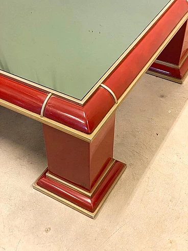 Large coffee table by Antonio Pavia years 70, red lacquered wood structure, brass profiles and mirrored glass top, the measures are the maximum, there are lines on the glass top