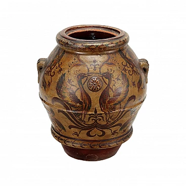 Large terracotta jar with polychrome grotesque decoration in a neo-Renaissance style. Noble coat of arms in evidence and engraved trademark.