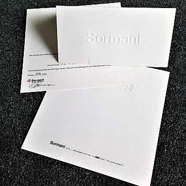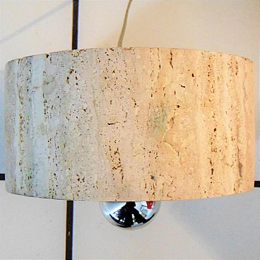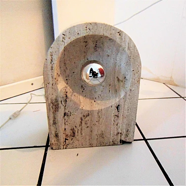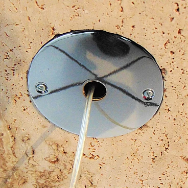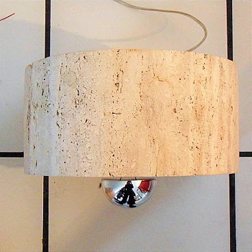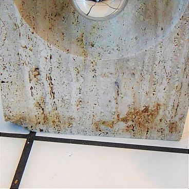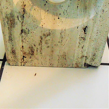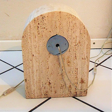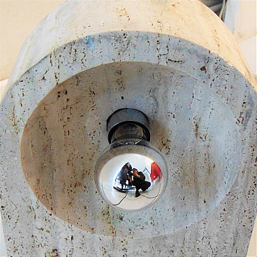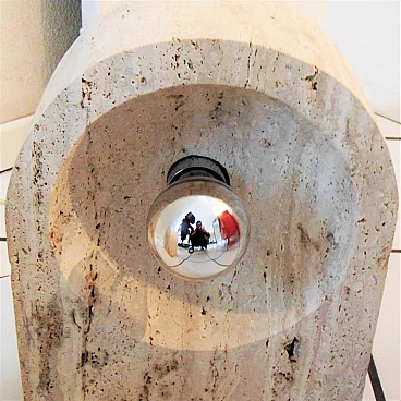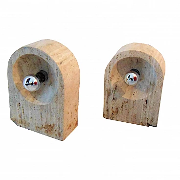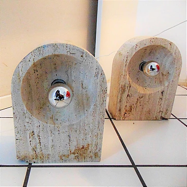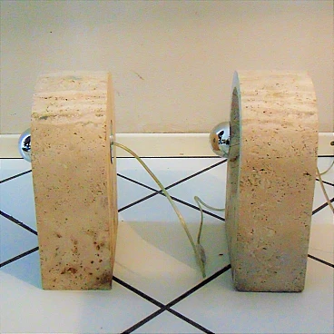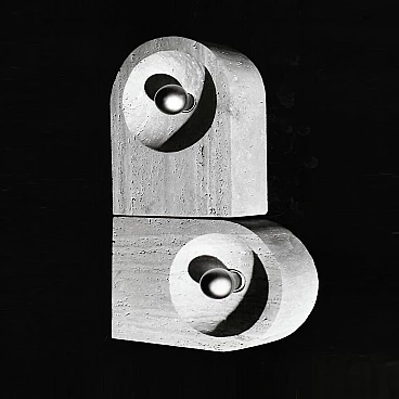 The Nucleo division was established to complement the Sormani production with accessories. A series of Avant Garde lighting elements was thus created. The vintage travertine lamp series is another example of the company's flexibility in the use of materials (steel, Perspex, marble, travertine, aluminium extrusions, plastic etc.). This pair of lamps by Giuliano Cesari was the first, original attempt to use a typically Italian stone such as travertine to manufacture state-of-the-art furnishing items. The lamps can be used as shown or superposed on the sizes in different ways, to create a sculptural effect. They are perfectly functioning and, although the stone shows some aging and chaps in the lower part, the chromed part on the back is in perfect condition (and totally original). Lamp bulbs are mirrored. The size of each lamp is height cm 35x W 25 x D 12 (inches: 13" 25/32 x 9" 27/32 x 4" 23/32). The set comes with a certificate of origin on original Sormani letterhead.