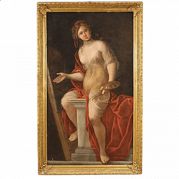 Oil painting on canvas from the 17th century depicting the allegory of Painting. Extraordinary was the painter's ability to depict the transparency of the robes and certain details such as earrings and hairstyle. The painting has been restored and restretched during the 19th century. Non-coeval frame in gilded wood and plaster. Without the frame the work measures 158 x 89 cm.