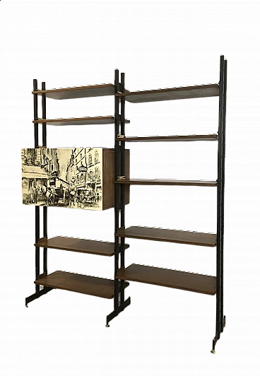 Modular teak bookcase with iron and brass uprights, bar module with Montmartre design print Dimensions L 160, H 190, D 44