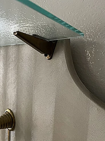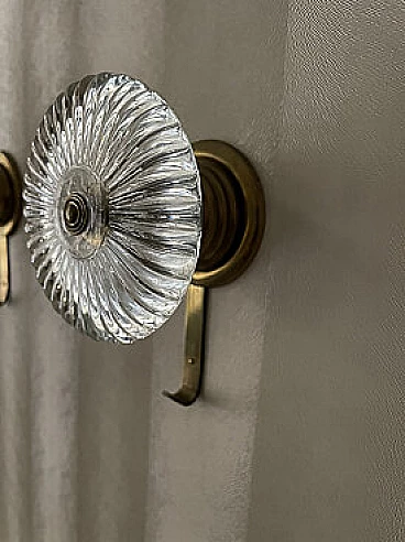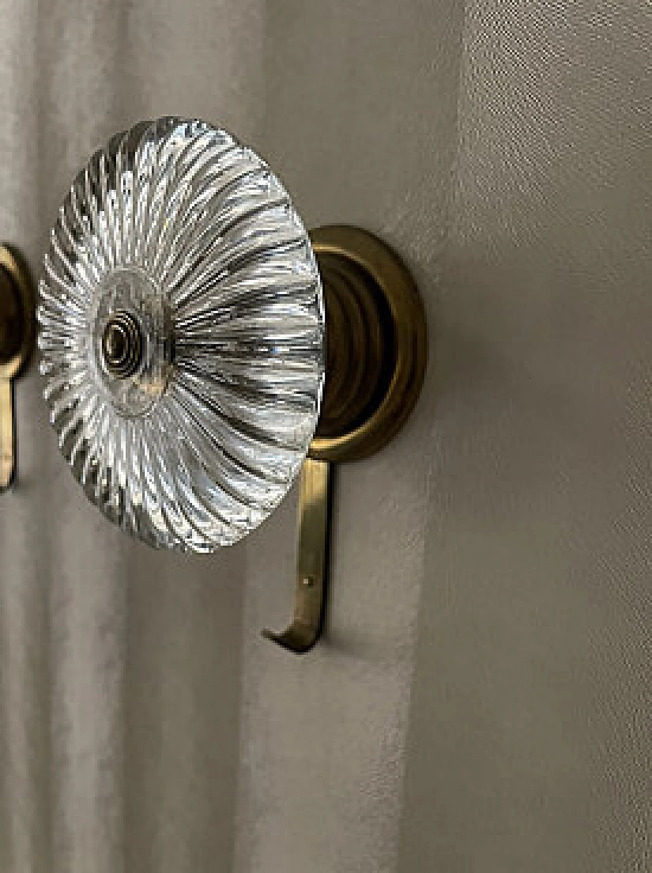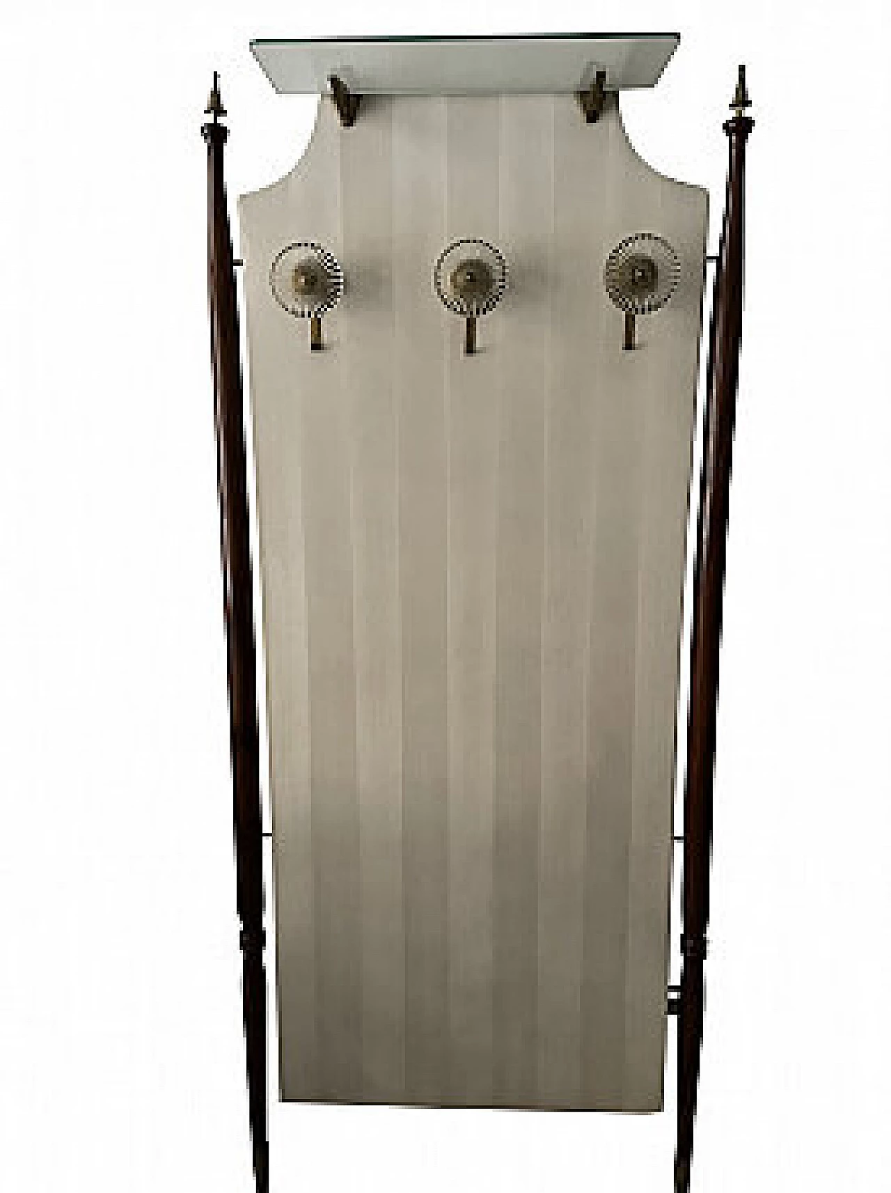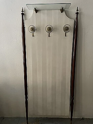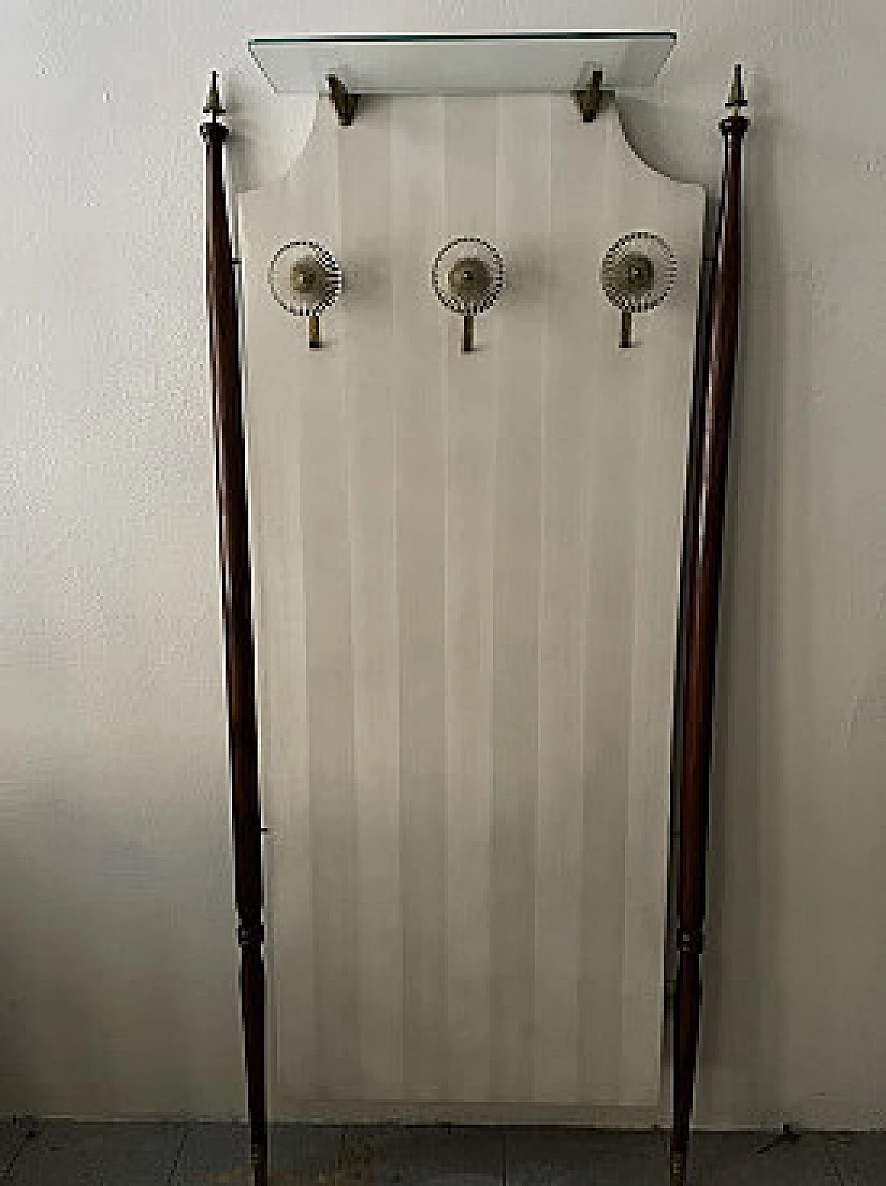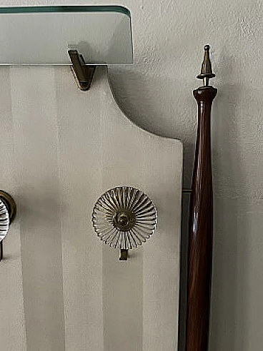Refined 1950s wall-mounted coat rack in ivory skai, mahogany wood, brass and crystal hangers