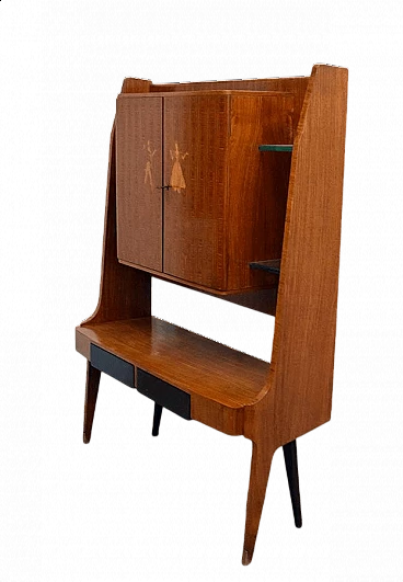 Vittorio Dassi bar cabinet from the 50s. In maple and mahogany wood, doors with inlaid decorations, with two drawers and thick crystal shelves both outside and inside. Back legs and drawers in dark color, bridge structure, brass tips. In excellent condition.