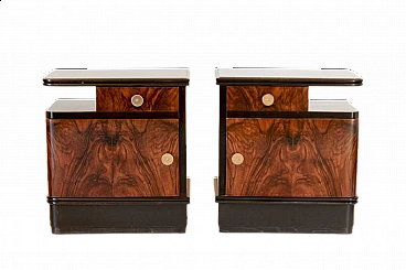 Pair of bedside tables art deco of the 30's. Structure in wood and briarwood and black opaline top. Brass knobs.