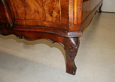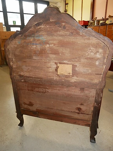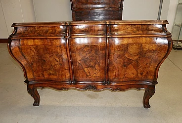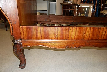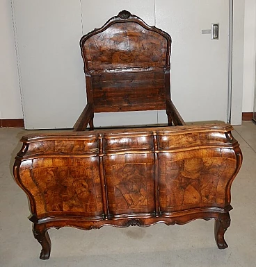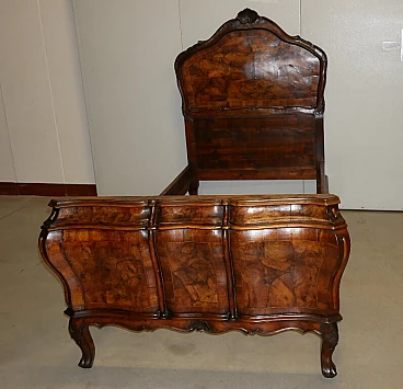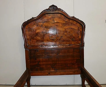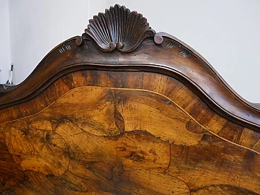 Beautiful workmanship with headboard frame in solid walnut shaped and carved. Rooted central panel with fillet at the edge. the headboard is in solid walnut.