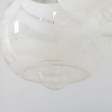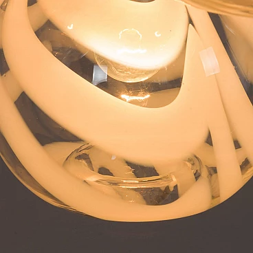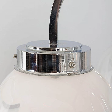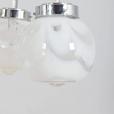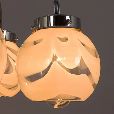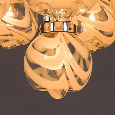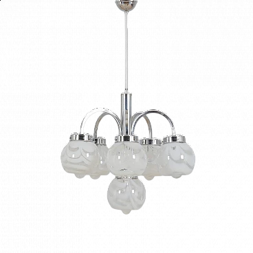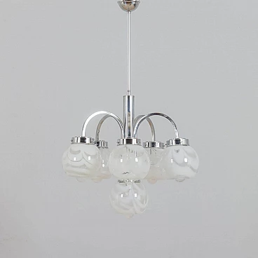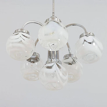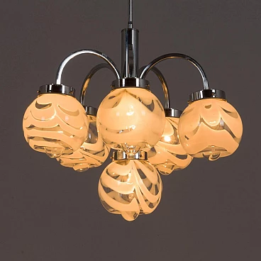 This chandelier was designed in the style of Mazzega in the 70s. The structure is in high quality chrome-plated steel and has six arms ended with lights. It features amazing hand-blown clear and milky white Murano glass lampshades with very unique shape and pattern. The so-called lattimo glass, is a special glass processing and the term comes from the Italian word latte, or milk. The lamp is in a great condition and fully functional. Minor traces of use. Original wiring and canopy. Height of rod: 42 cm.
