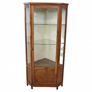 Beautiful elegant antique corner cabinet early decades of the twentieth century very simple and linear. Made of fine walnut wood and characterized by refined decoration inlaid with maple wood threading. The door is glazed in the upper part to expose your precious objects while a lower part remains blind. Upholstered on the bottom with white fabric. Great elegance perfect for displaying your collectibles large useful space inside with glass shelves. Excellent general condition. We recommend that you look in detail all the attached photos. Proposed at an excellent price negotiable we invite you to send us your proposals to purchase we will evaluate with pleasure. Professional packaging, insured shipping with couriers, delivery by appointment only street level, no porterage to the floors.