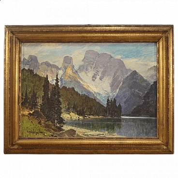 Italian painting of the first half of the twentieth century. Oil painting on canvas depicting fabulous view of the lake with mountains in the background of excellent pictorial hand. Painting of great size and pleasant brightness characterized by particular shades of color in the water and in the mountains covered with snow and hit by the sun (see photo). Work signed in the lower left corner C. Bentivoglio (see photo) referable to the famous painter Cesare Bentivoglio (1868-1952) lacking authentication and additional documentation. Wood and plaster frame finely carved and gilded (bronze tint) structurally sound, with some small signs of time (see photo). Work in first canvas that has undergone a slight restoration with patch visible on the back (see photo). Painting overall in good state of preservation with some small signs of time. Light painting H 68 x L 98 cm.