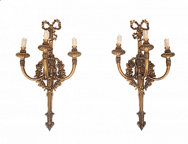 Pair of gilded, embossed and chased three-armed Louis XVI bronze wall sconces. A garland with racemes and leaves links the three arms. Condition: Very good. Provenance: France (1870/80). Document: Certificate of authenticity. Assistance: We are at your disposal for further clarifications or photographic details. Shipping: All over Italy, Europe and the rest of the world at very low prices with maximum security and traceability. Shipping will be agreed privately and will not have a high cost.
