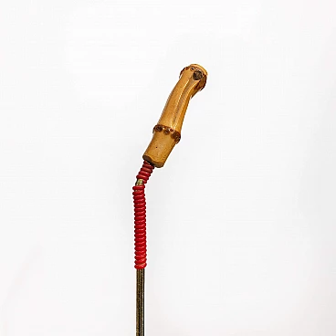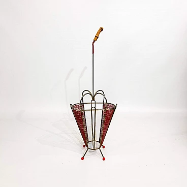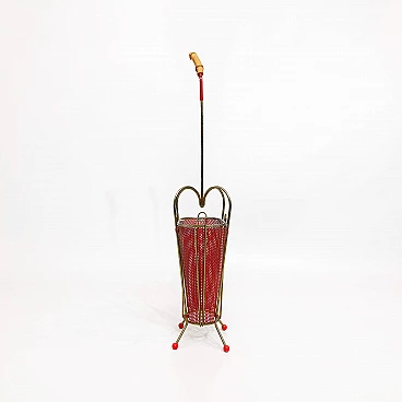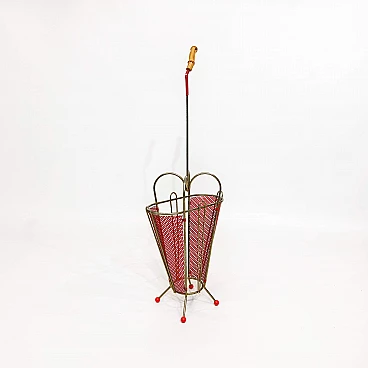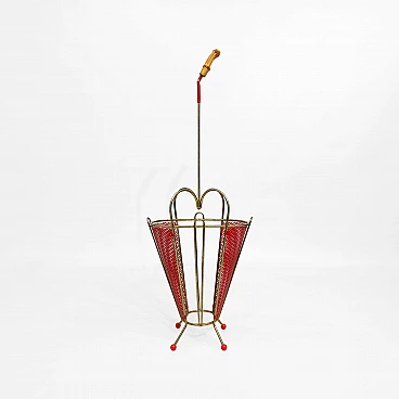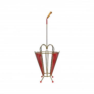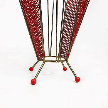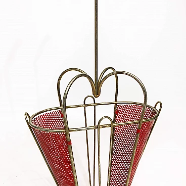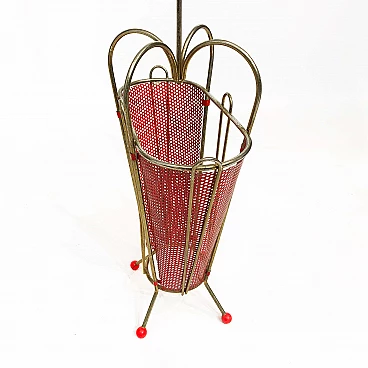 This modernist umbrella stand, attributed to renowned Franco-Hungarian designer Mathieu Matégot, features four plastic spherical feet, supporting a basket made of patinated brass and an organic, curved perforated metal sheet. The brass frame flows into a crown at the peak of the basket, from which protrudes a brass holder with wooden end. This is a truly amazing piece, very much rooted in the 1950s but with the ability to sit in any interior due to its versatility.