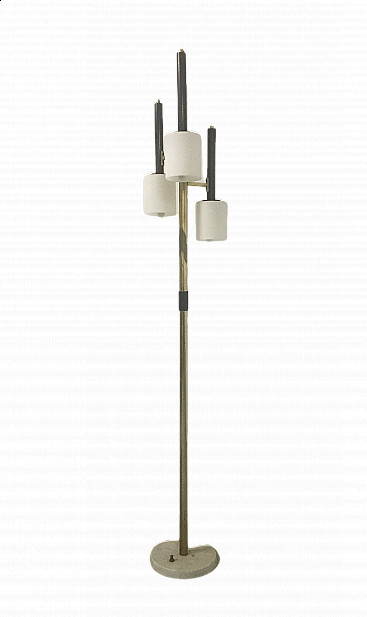 Floor lamp of the 50s in the style of Stilnovo, brass stem, white marble base and opaline glass diffusers, well preserved Height 175 cm
