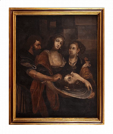 The painting depicts a biblical subject narrated in the Gospels of Mark and Matthew, whose protagonists are Herodias and her daughter Salome. During the birthday party of Herod Antipas, Salome's stepfather, the young girl danced for him, entertaining him and his guests at a rich banquet. To reward his stepdaughter, Herod promised to give her anything she wished. Salome, urged on by her mother, wanted the head of St John the Baptist, who had strongly condemned the behaviour of Herod and his mistress. The Baptist was killed and Salome gave her mother his head, which she placed on a silver tray. In the foreground is the Evangelist's head, which is violently held by the executioner, while the two women look towards the king, proud of what they have done. Condition: Excellent condition Contemporary frame. Provenance: 17th century Rome. Document: Certificate of Authenticity. Assistance: We are at your disposal for further clarifications or photographic details. Shipping: All over Italy, Europe and the rest of the world at very low prices, with maximum security and traceability. Shipping will be agreed privately and will not be expensive.