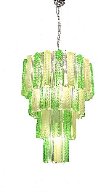 Large tube chandelier in mint green Murano glass. Composed of clear transparent prisms mixed with light green and mint green tubes. It has 7 lights. Requires E14 bulbs. Height including ceiling canopy chain 145 cm. Height without chain from top floor to top floor 74 cm. New wiring installed compatible with UK, EUROPE, USA. Shipping in a wooden crate for safe arrival.