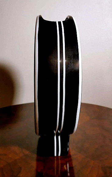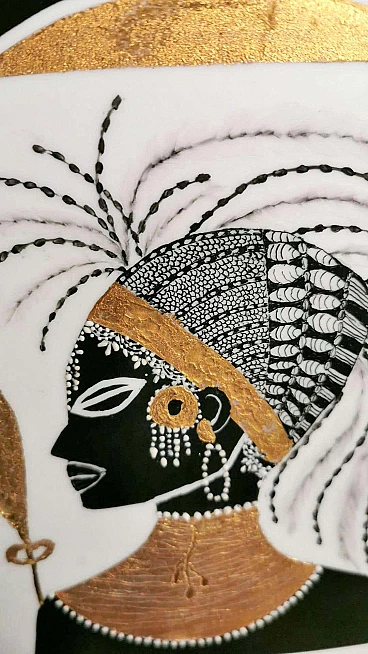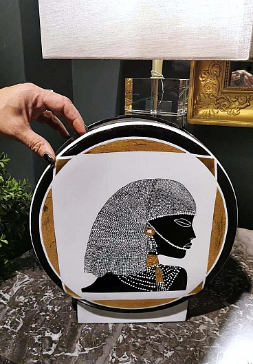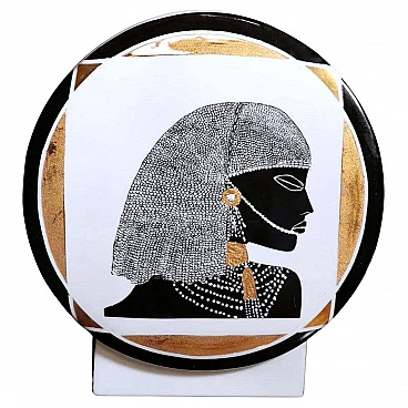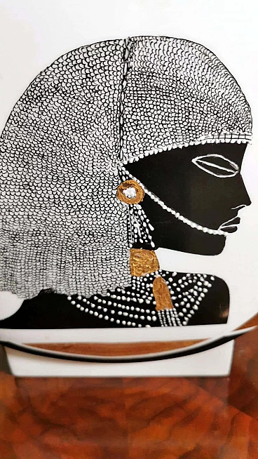 French circular vase made of white porcelain; the shape is very original and unique; on the front and on the back are hand painted two very stylized heads of African women wearing rich jewels, headdresses, necklaces and earrings; the figures and the vase are embellished with pure gold decorations; The figures and the vase are embellished with pure gold decorations; on the bottom is the signature of the artist who created this vase in 2009 in Paris, France; unfortunately we have no information about her artistic activity, she was certainly a very skilled and talented painter who lent her work to a porcelain workshop; we could only know that she was born in 1937 in Paris and died on 29 April 2011. The dynamism of her drawing and the freshness of her colours make this vase particularly interesting and fascinating.
