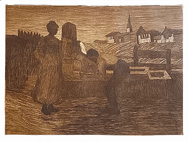 Painter and engraver, son of the more famous painter Giovanni Segantini (1858 - 1899). He became interested in art thanks to his father, whom he lost when he was only 17. He assimilated all the most profound aspects of his father's technique, so much so that he devoted himself with respect and admiration to reproducing his works through drawing and engraving, in which he achieved great skill. He then enrolled at the Brera Academy, renewing his father's Divisionism with a vigorous use of colour. He moved to Rome and then to Zurich, where he was able to capture urban views with the same vividness. He settled definitively in Maloja, rediscovering his beloved landscapes en plein air but not neglecting still lifes or interior scenes. His engraving work, as well as that of his brothers, is still to be investigated. Of note are a collection of Engadine engravings published in 1913 by the publisher Wolft in Leipzig and a Giovanni Segantini collection, 12 etching reproductions by his sons Mario and Gottardo, Società Editoriale d'arte Divisionista (Milan, s. d. c. 1915). On this sheet, in the foreground, two figures are depicted: a man and a woman near a fountain, one of those made for watering livestock. The man is depicted bent over while drinking from a bucket, the woman standing on the left holds a faggot in her right hand and seems to be looking at the curious viewer. Behind them in the distance, beyond the fence, is the profile of Savognino. The engraving faithfully reproduces a pencil drawing with coloured chalk by Giovanni Segantini: Amore alla fontana (Love at the Fountain), 1892. The engraving technique faithfully reproduces Giovanni's filamentary Divisionist technique. In addition to the etching, aquatint is visible between the marks and especially in the sky. The use of monotype highlights the white foam of the water coming out of the fountain and the walls of the houses bathed in moonlight. Considering the subject and the quality of the sign and impression, it is proposed that the work be attributed to Gottardo, who seems to be the most skilled of the Segantini brothers. Excellent impression. Very good state of preservation. Wide margins beyond the copper stop. Bibliography for the subject: Annie-Paule Quinsac, Giovanni Segantini catalogo generale, vol 1, n.287
