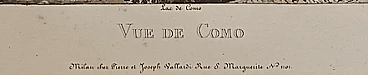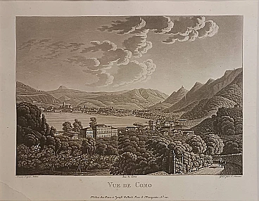 In this print we see a romantic view of the city of Como. The sun, now low in the sky, tepidly illuminates the valley with its lush and orderly vegetation. The viewer's gaze on the hill behind Villa Olmo extends beyond the villa and the vegetation, down to the calm waters of the lake and embraces the eastern shore with its houses and cathedral. Mountain ranges enclose the background while in the foreground on the right we see a farmer riding his horse up the ridge along a dirt road. The town appears calm and the silvery grey atmosphere, typical of the 19th century, enhances the architectural and landscape details. At the bottom of the image "Dessiné d'apres Nature Lac de Como Gravé par A. Lanzani/Vue de Como/Milano chez Pierre e Joseph Vallardi Rue S. Margherita n 1101". Pietro and Giuseppe founded their company of publishers and merchants in 1812 and dissolved it in 1818. The printing is therefore dated to those years. Engraver and draughtsman. From 1823 to 1825 he attended the Brera Academy of Fine Arts, receiving prizes for some of his drawings. He specialised in engravings using the aquatint technique and in 1826 he collaborated on Ferrario's work, Il costume antico e moderno di tutti i popoli (Ancient and modern customs of all peoples). Very good condition, except for a crease in the lower left white corner. Wide margins beyond the copper plate. Bibliography: Margheritis, Sinistri, Invernizzi, Peverelli, Como e Lecco nelle antiche stampe, n.122