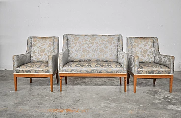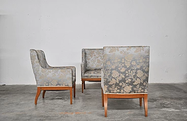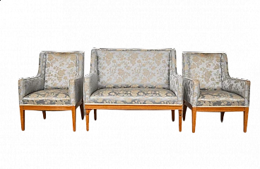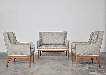 Austrian ashwood and silk sofa and pair of armchairs, 1930s
