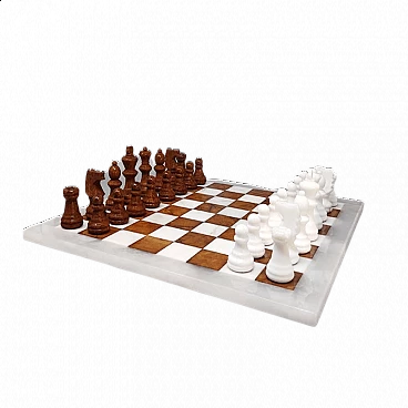 1970s Gorgeous brown and white chess set in Volterra alabaster. Handmade Made in Italy, the items are in excellent condition. This chess set is a beautiful piece of modern art.