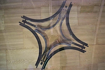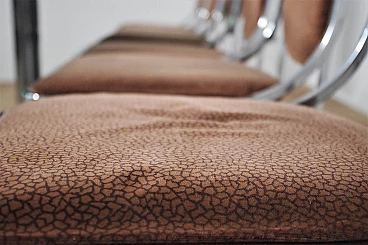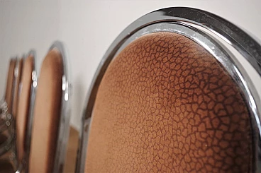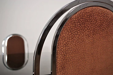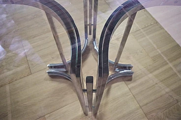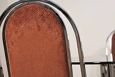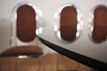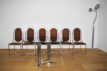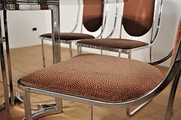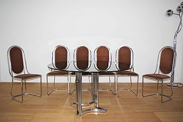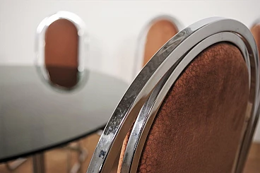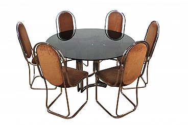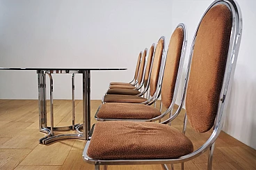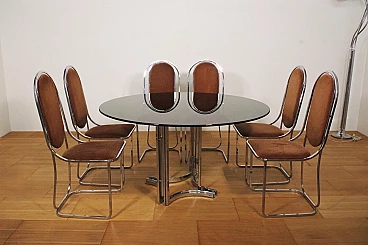 Table in metal and smoked glass top with 6 chairs in metal and fabric by Alessandro Albrizzi, 70s