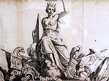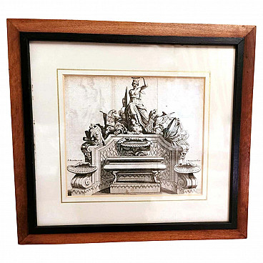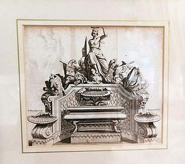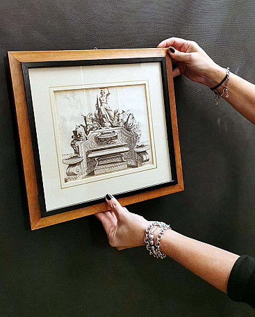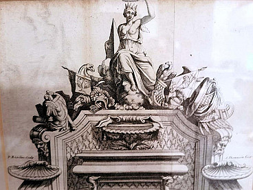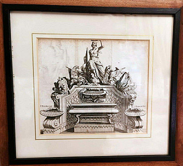 Beautiful and meticulous engraving with a sober wooden frame; the paper work, "La Gloire de la France", was made by the famous French engraver Simon Thomassin (Troyes 1665-Paris 1733) in 1724. He made the drawing inspired by an elaborate and particular sculpture, made for the gardens of Versailles, between 1681 and 1683 by Pierre Mazeline (1632-1708), an important French neoclassical artist; In the Garden's inventory of 1706-1708, the statuary group is described as follows: "A figure representing Glory seated on a cloud placed on a celestial globe, surrounded by trophies of arms, with the right arm half raised, holding a laurel wreath, and, with the left, a pyramid. The names of the two artists are stamped on the print itself. Simon Thomasin was a French engraver of burins, member of the Académie royale de peinture et de sculpture and engraver to the king. In 1694 he published his most famous work, on which he had been working since 1689: the Recueil des statues, groupes, fontaines ... , du chateau & parc de Versailles, a collection of 218 engraved plates made from his drawings of statues, groups, reliefs, fountains and other ornaments of the Palace of Versailles and its gardens, of which a second edition was made in The Hague in 1724 with texts in French, Latin, Italian and Dutch, our print is number 131 of that volume made with the technique of engraving by burin and etching (see photo). Many of his works are exhibited in museums around the world, a large collection being held at the British Museum in London. The print has been framed in recent times. The frame measures width cm.35, height cm.32, depth cm.3. The print measures width 20 cm, height 18 cm. For all our shipments we use special packaging materials (wooden crates, polystyrene, etc.) for maximum protection and safety of the objects.