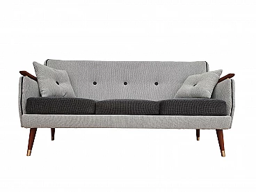 Retro sofa in Scandinavian design. Made in about 1970. Completely renovated in quality gray / white wool fabric by furniture craftsman. Black leather buttons and bored on the back. Two extra cushions with black leather buttons. Brand new padding with natural coconut mat. Original fourth in seat cushions. Mahogany wood legs and armrests. Brass elements on the legs and under armrests. Wood components has no defects, but it may show slight traces of use. This vintage item is in very good condition because it has been refreshed through new upholstery and/or refinishing.