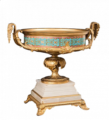 French Napoleon III bowl in gilded bronze cloisonné and onyx. The central bowl has a border decorated with cloisonné and is embellished with leaf motif handles. The central stem also bearing a leaf motif rests on a degrading onyx base. The four feet are in gilded bronze finely chiseled typical of the Napoleon III period. Stamped: Barbedienne Condition: Perfect condition Measurements: Diameter 35cm.Height 31cm. Provenance: France 19th century. Document: Certificate of Authenticity. We are at your disposal for further clarifications or photographic details.