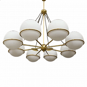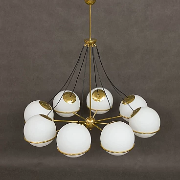 Brass chandelier in the Gino Sarfatti style with 8 opaline glass globes, 1970s
