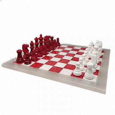 1970s Elegant red and white chess set in Volterra alabaster handmade. Made in Italy. The items are in excellent condition. The pieces of this chess set are sculptures. So rare to find these colors