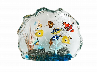 Murano glass sculpture representing an aquarium with tropical fishes, realized with the Sommerso technique. This small microcosm of a tropical sea is handmade with a very special and difficult technique: first the master glassmaker creates the fish separately and then melts them at high temperatures in a layer of glass that looks like a stone. The sculpture has the original signature of the master glassmaker and famous artist "Diego Costantini Murano" engraved on the base. Each aquarium is a unique piece as the composition of the fish and their colour are unique. For this reason it is guaranteed that the artwork in the photo is exactly the artwork for sale that will be received.