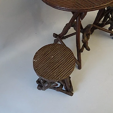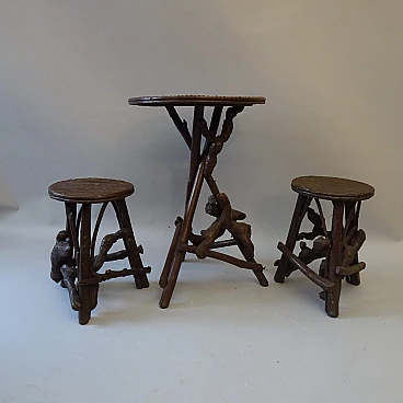 Coffee table and pair of stools in wood and bamboo, 1930s