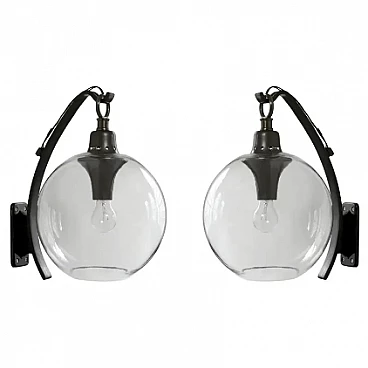 Pair of Boccia wall lamps designed by Luigi Caccia Dominioni for the Azucena factory, Italy, 1969. The particularity of the lamps is their cup shape made entirely of glass. The structures of the lamps are made of black iron and have a rounded shape. The apex of the structure supports the glass bowl, through a rounded construction in the upper part of the lamp. Wear consistent with age and use: The lamps show some light marks consistent with their age. They are in good, original period condition. Literature: Repertorio del Design Italiano 1950-2000 by Giuliana Gramigna, Vol. I, Milan.