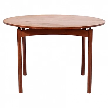 Extendable table made entirely of wood by designer Finn Juhl in the 1960s. The table is extendable through its mechanism that opens the two circumferences. Inside there is an extension: a teak wood module that is applied to the surface. In this way the table becomes oval. Its perfectly shaped feet with clean, sharp lines give stability to the table. The closed table can be used as a breakfast table and if necessary can be extended to serve as a dining table. Original label under the top. Wear consistent with age and use. The table is in its original condition, it has some scratches on the top due to age. Restoration is possible on request, at a slight extra charge.