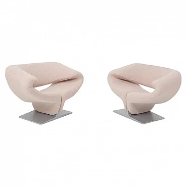 Pair of Artifort Ribbon Chair. This historical icon of modern design was created by Parisian designer Pierre Paulin for Artifort in 1966. The Ribbon Chair continues to be produced by Artifort in the Netherlands. Pierre Paulin trained as a sculptor in Paris and used his vision to create free-standing chairs that transcend modernist sculpture. His Ribbon Chair is a beautiful example of applied art that complements any collection. The chair has a simple and clean space-age ergonomic shape to fit the body. The chair consists of a metal frame with horizontal springs, covered in foam and pink bouclé fabric with a steel pedestal. In very good condition, the pedestals show only minor scratches. The bouclé fabric is perfect.